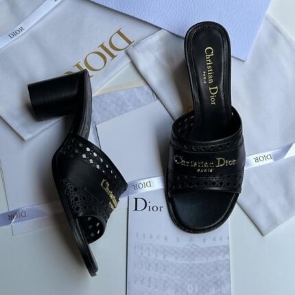 Christian Dior D-Lane Camel Calfskin with Openwork Microcannage Motif Heels Slides Pumps Sandals Black