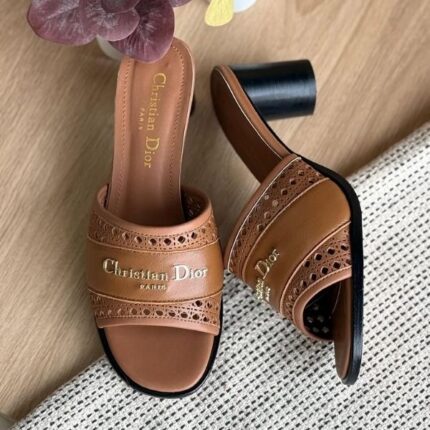 Christian Dior D-Lane Camel Calfskin with Openwork Microcannage Motif Heels Slides Pumps Sandals Brown