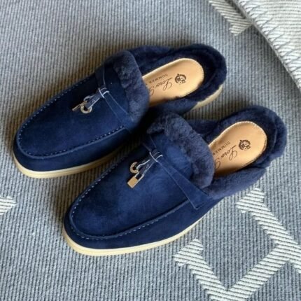 Loro Piana Charm Suede Fur Mules Slip-Ons Flats Shoes Navy Blue