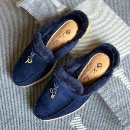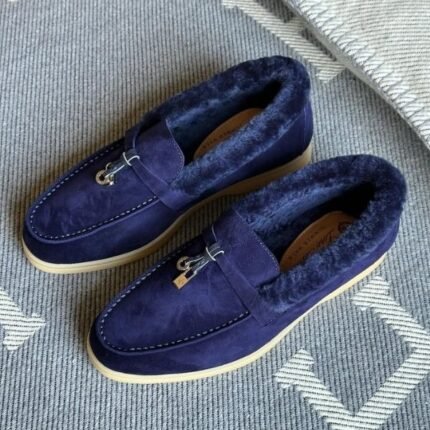 Loro Piana Charm Suede Fur Loafers Slip-Ons Flats Shoes Navy Blue