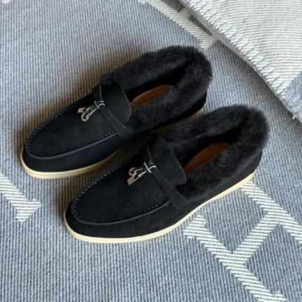 Loro Piana Charm Suede Fur Loafers Slip-Ons Flats Shoes Black