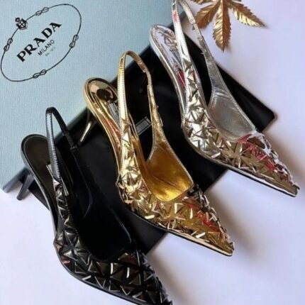 Prada Metallic Slingback Pointed Toe Heels Sandals Pumps Black