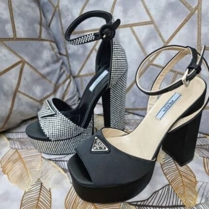 Prada Logo Embellished Crystal Ankle Strap Block Heels Pumps Platforms Sandals 135mm Black Silver