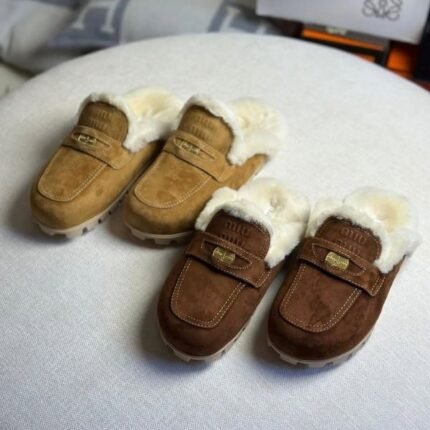 Miu Miu Logo-Embossed Fur Suede Mules Slip-On Cocoa Brown