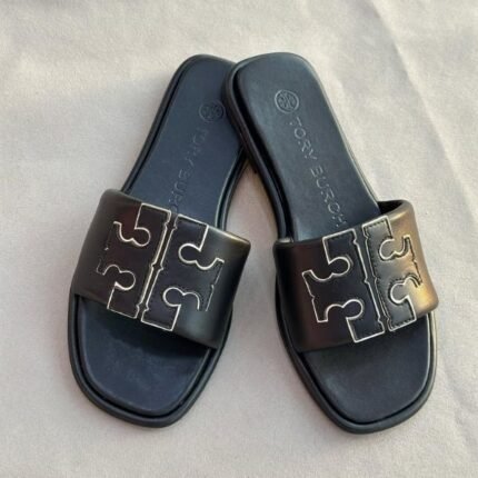 Tory Burch Black Leather Double T Flats Slides Slip-Ons Sandals Black