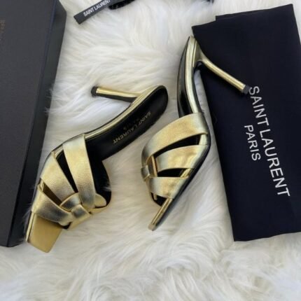 Yves Saint Laurent Calfskin Tribute 85 High Heels Sandals Slides Mules Gold
