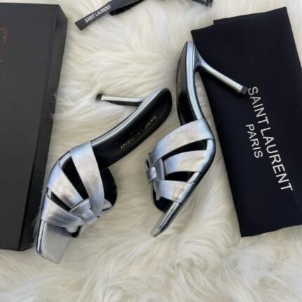 Yves Saint Laurent Calfskin Tribute 85 High Heels Sandals Slides Mules Silver