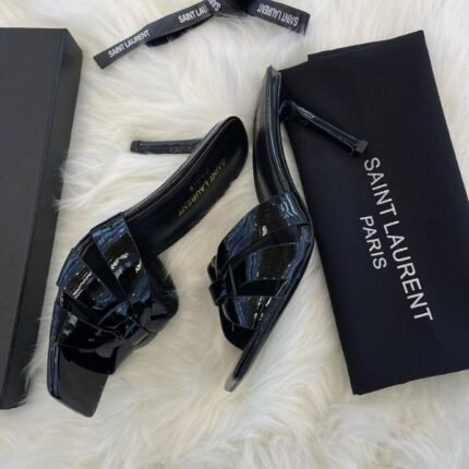 Yves Saint Laurent Calfskin Tribute 85 High Heels Sandals Slides Mules Black Glossy