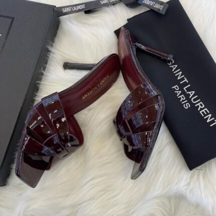 Yves Saint Laurent Calfskin Tribute 85 High Heels Sandals Slides Mules Maroon Glossy