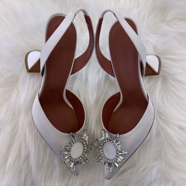 Amina Muaddi Begum 95mm Satin Slingback Pumps Pointed Heels Sandals White