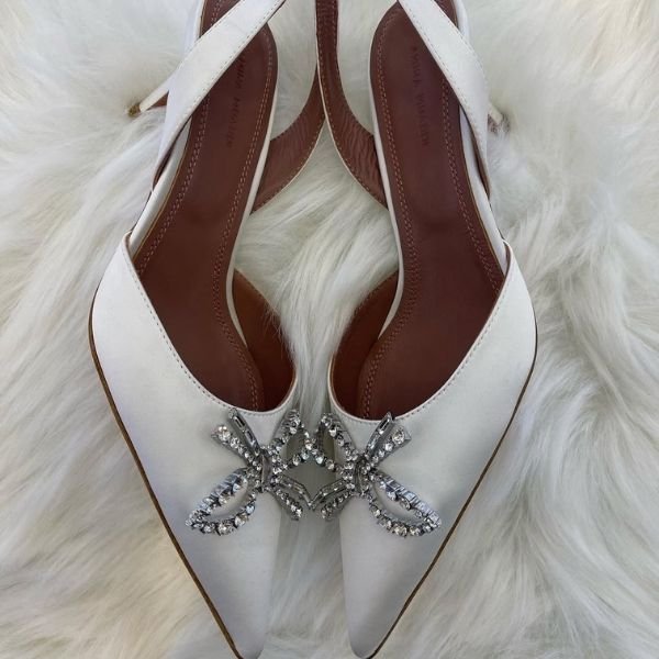 Amina Muaddi Rosie Leather Crystal Bow 60mm Slingback Pumps Pointed Heels Sandals White
