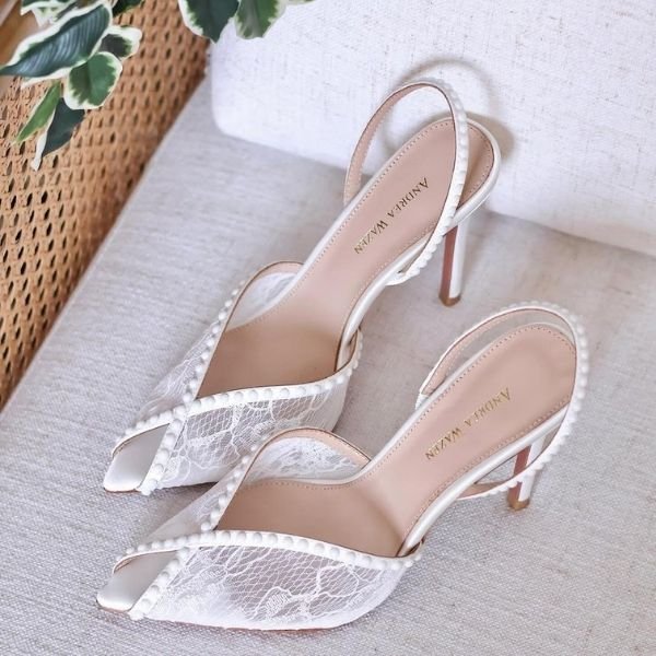 Andrea Wazen Katy Sling Lace 105mm Slingback High Heels Pumps Sandals White