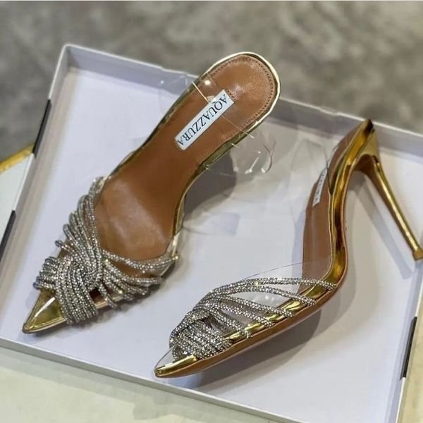 Aquazzura Gatsby Crystal-Embellished Satin 50mm Pumps Slingback Heels Sandals Pointed Toe Silver Gold