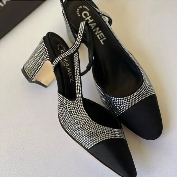 Chanel Crystal Strass Grosgrain Cap Toe CC Slingback Pumps 37 Heels Tweed Slingback Silver Black