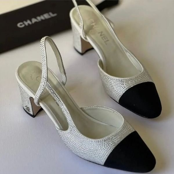 Chanel Crystal Strass Grosgrain Cap Toe CC Slingback Pumps 37 Heels Tweed Slingback Silver White