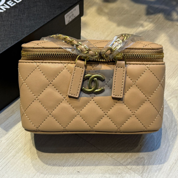 Chanel Lambskin Quilted Pearl Crush Vanity Case With Chain Shoulder Bag Gold Tan with Free Perfume
