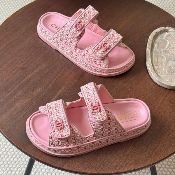 Chanel Tweed CC Velcro Flats Slides Slip-Ons Shoes Sandals Pink