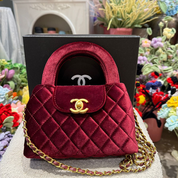 Chanel Velvet Quilted Nano Kelly Shopper Top Handle Shoulder Hand Bag Crossbody Strap Gold Burgundy with Free Perfume