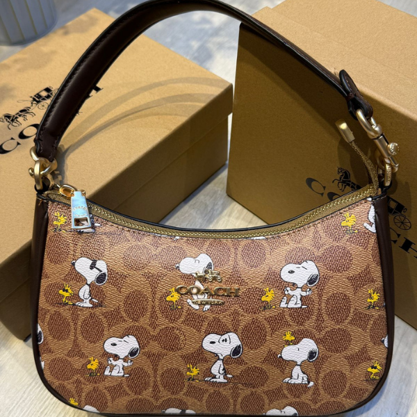 Coach Teri Shoulder Hand Bag In Signature Canvas Snoopy Print Tan with Free Perfume