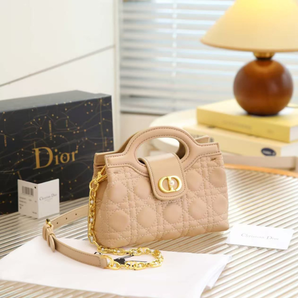 Dior Jolie Cannage Lambskin Leather Top Handle Hand Shoulder Bag Crossbody Strap Gold Beige with Free Perfume 18.5x13x8.5cm