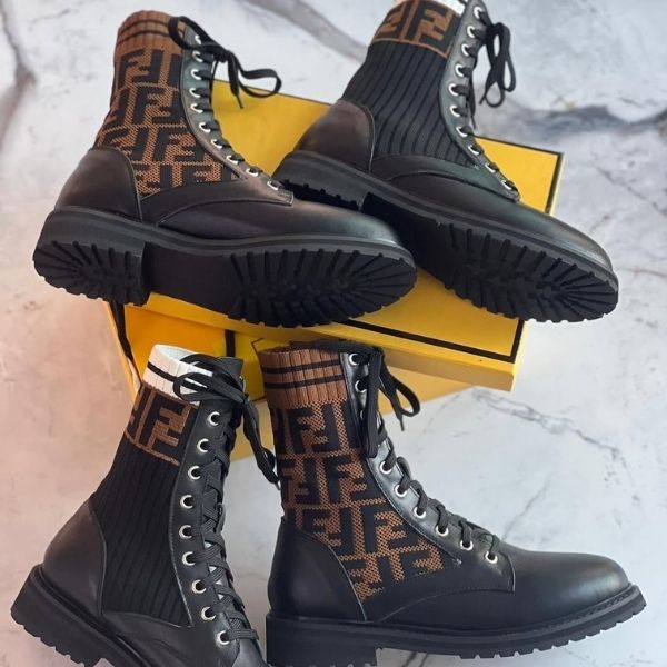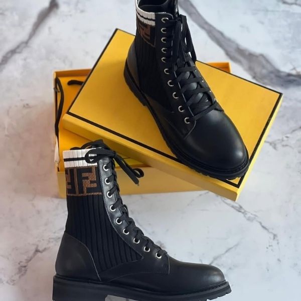Fendi Black Leather FF Junior Biker Boots Stretch Fabric Black White Brown Stripes