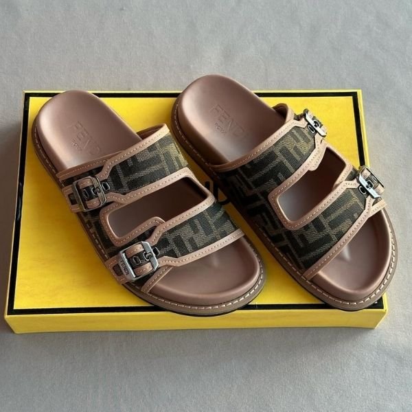 Fendi Feel FF-Jacquard Zucca Canvas and Leather Strap Flat Slides Sandals Slip-Ons Brown Green