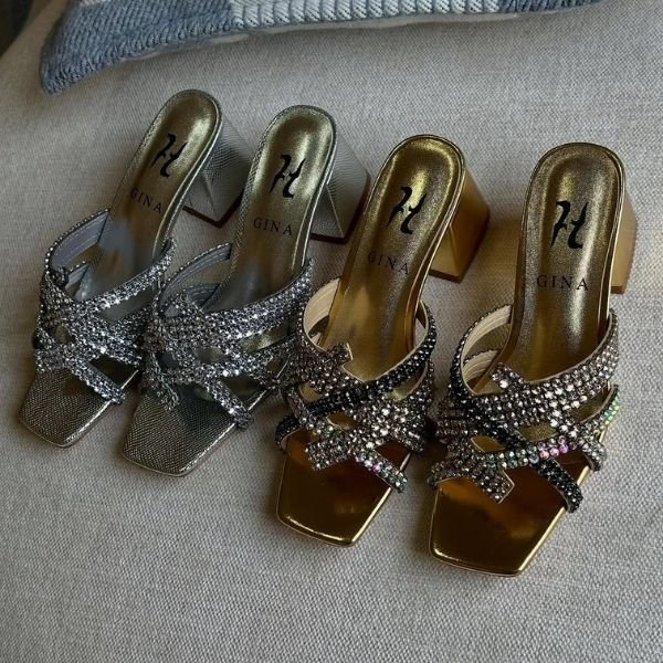 Gina Metallic Leather Crystal Embellished Blocked Heels Slip-Ons Sandals Silver