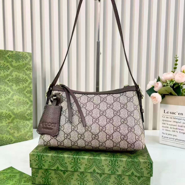 Gucci Emblem Monogram GG Signature Leather Shoulder Hand Bag Brown Beige with Free Perfume l25cmxw9cmxh11cm