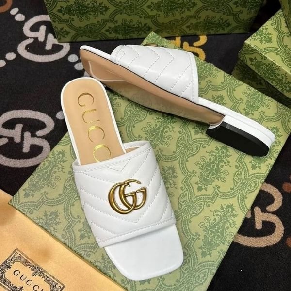 Gucci Marmont GG Padded Quilted Leather Slides Slip-On Sandals Flats White