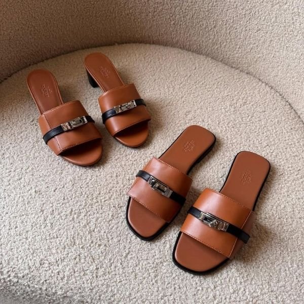 Hermès Gigi Giulia 50mm Block Heels Sandals Slip-Ons Tan Black Buckle
