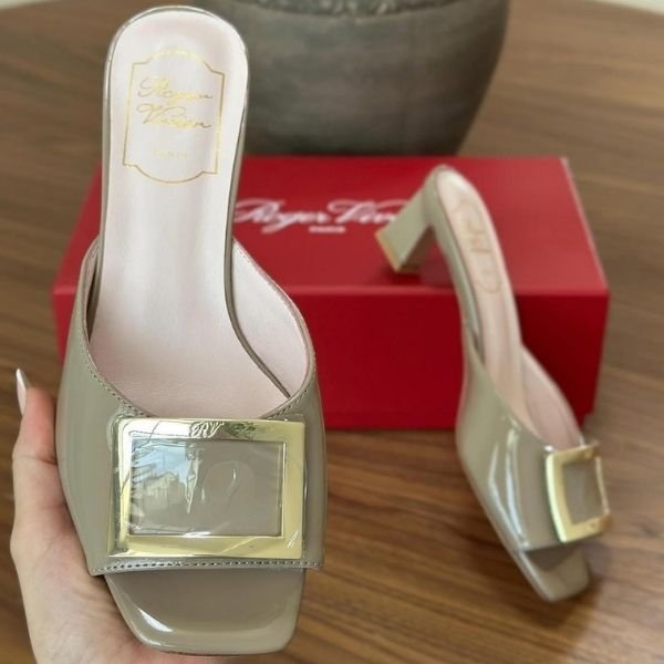 Roger Vivier Patent Leather Trompette Mules Heels Slip-Ons Slides Sandals Taupe Gray