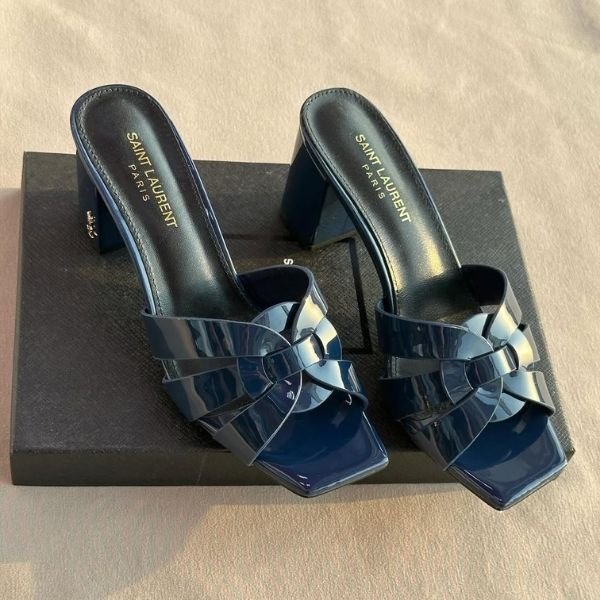 Saint Laurent Tribute Comfort Sandals Slide Heels Navy Blue Glossy