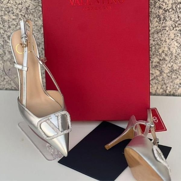 Valentino Vlogo Cystal Signature Patent Leather Slingback Pump Heels Pointed Toe 80mm Silver