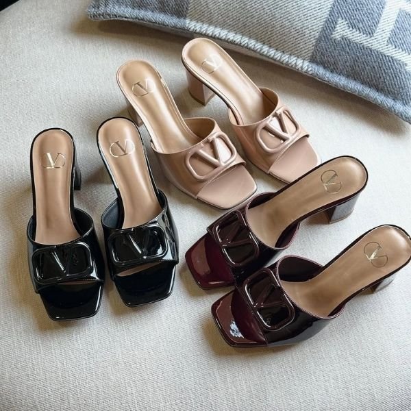 Valentino Vlogo Signature Patent Leather Block Heels Slides Sandals Slip-Ons 60mm Black