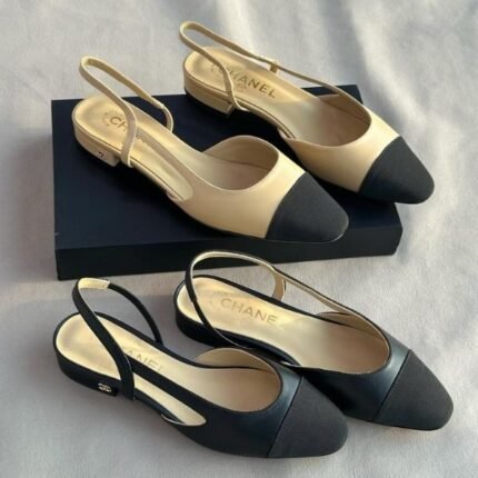 Chanel Leather Slingback Cap Toe Ballet Ballerina Flats Sandals Black