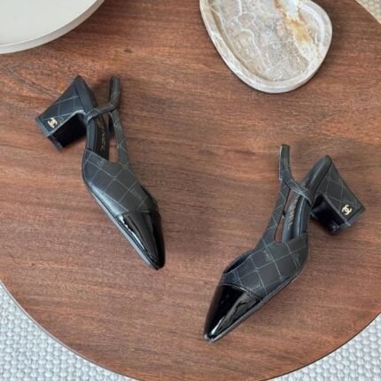 Chanel Tweed Slingback Pumps Heels Sandals 65 Printed Lambskin Patent Leather Black