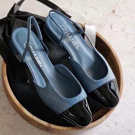 Chanel Tweed Slingback Flats Sandals Printed Lambskin Patent Leather Blue
