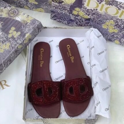 Christian Dior Crystal Embellished Sabot Flat Slip-Ons Slides D-club Burgundy