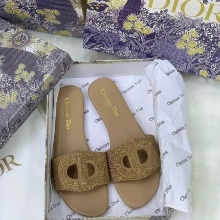 Christian Dior Crystal Embellished Sabot Flat Slip-Ons Slides D-club Gold