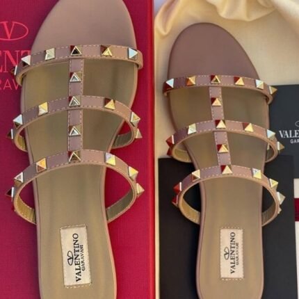 Valentino Leather Rockstud Flats Slide Sandals Slip-Ons Nude Beige