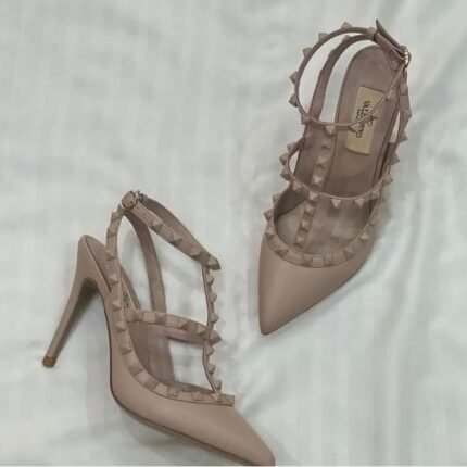 Valentino Rockstud Ankle Strap Pump With Tonal Studs Slingback Pump Heels Pointed Toe 100mm Beige