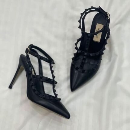 Valentino Rockstud Ankle Strap Pump With Tonal Studs Slingback Pump Heels Pointed Toe 100mm Black