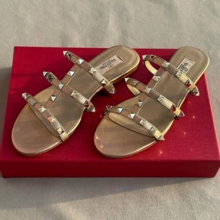 Valentino Leather Rockstud Flats Slide Sandals Slip-Ons Nude Beige
