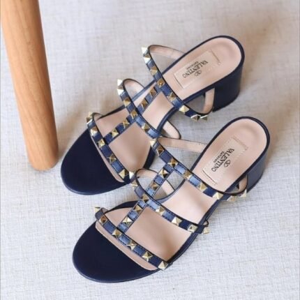 Valentino Leather Rockstud Block Heels Slide Sandals Navy Blue